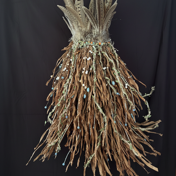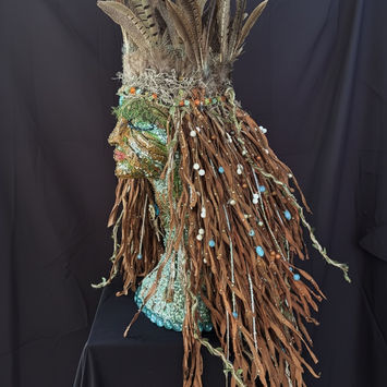My work is an act of spiritual archaeology. These Goddesses represent the excavation and construction of my new self. They are but one facet of the multimedia archive of a life reclaimed. I create them not as distant icons to be worshipped, but as mirrors of a resurrected self. Using a meticulous, almost obsessive process involving thousands of micro-beads, sequins, hand-painted seeds, pins, wire, heirloom jewelry and other found objects, I reconstruct the fragmented parts of the female experience into a unified, sacred whole.